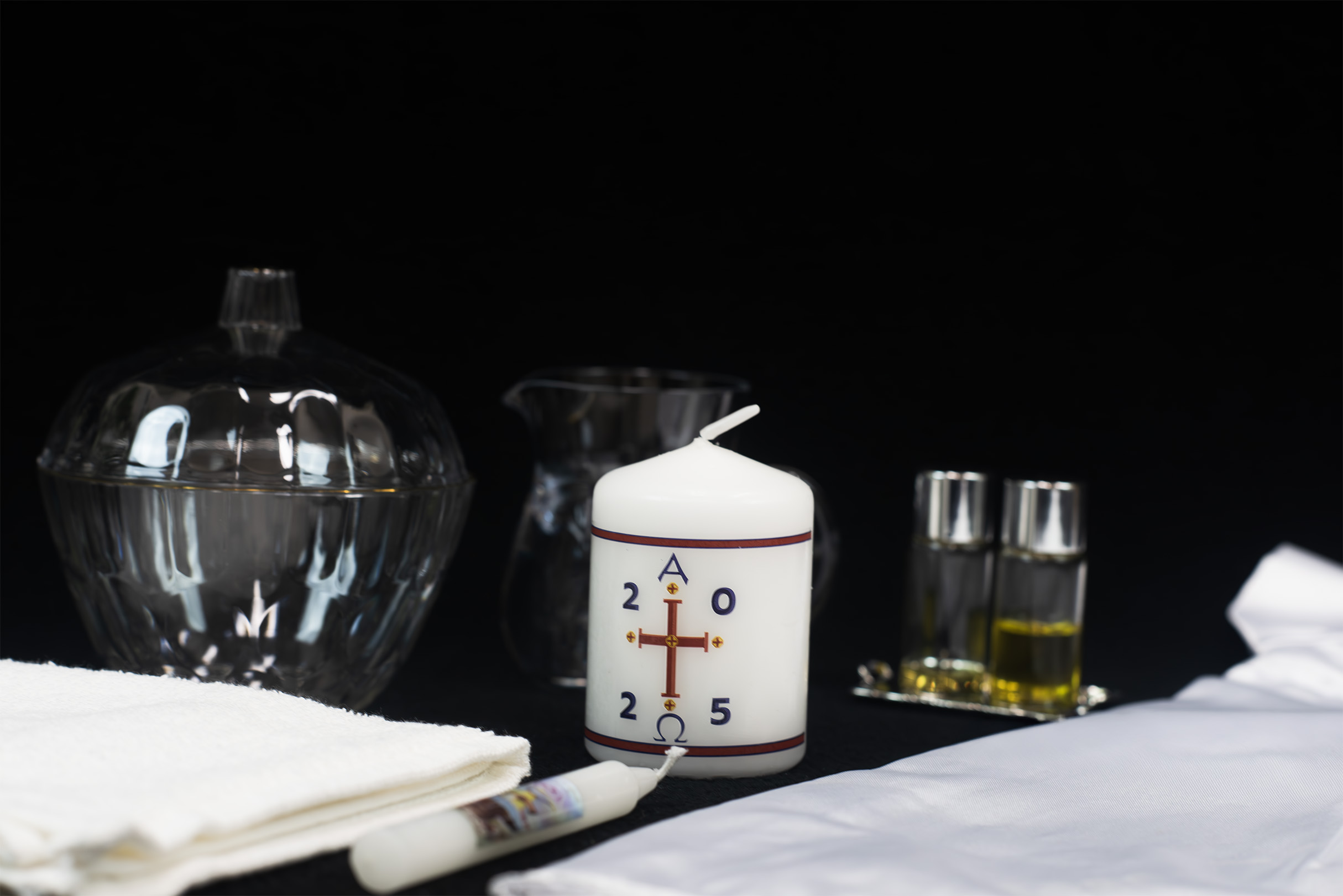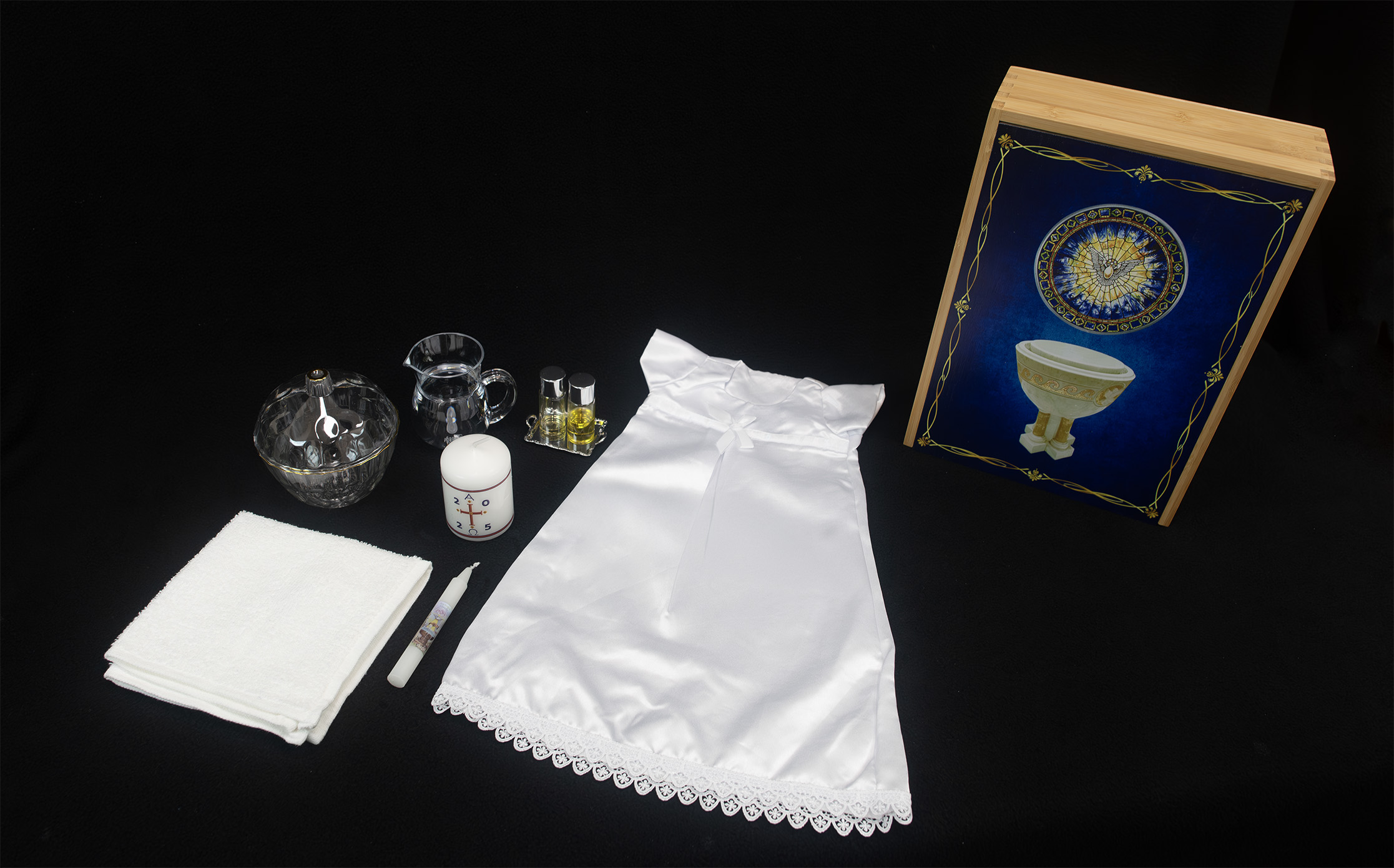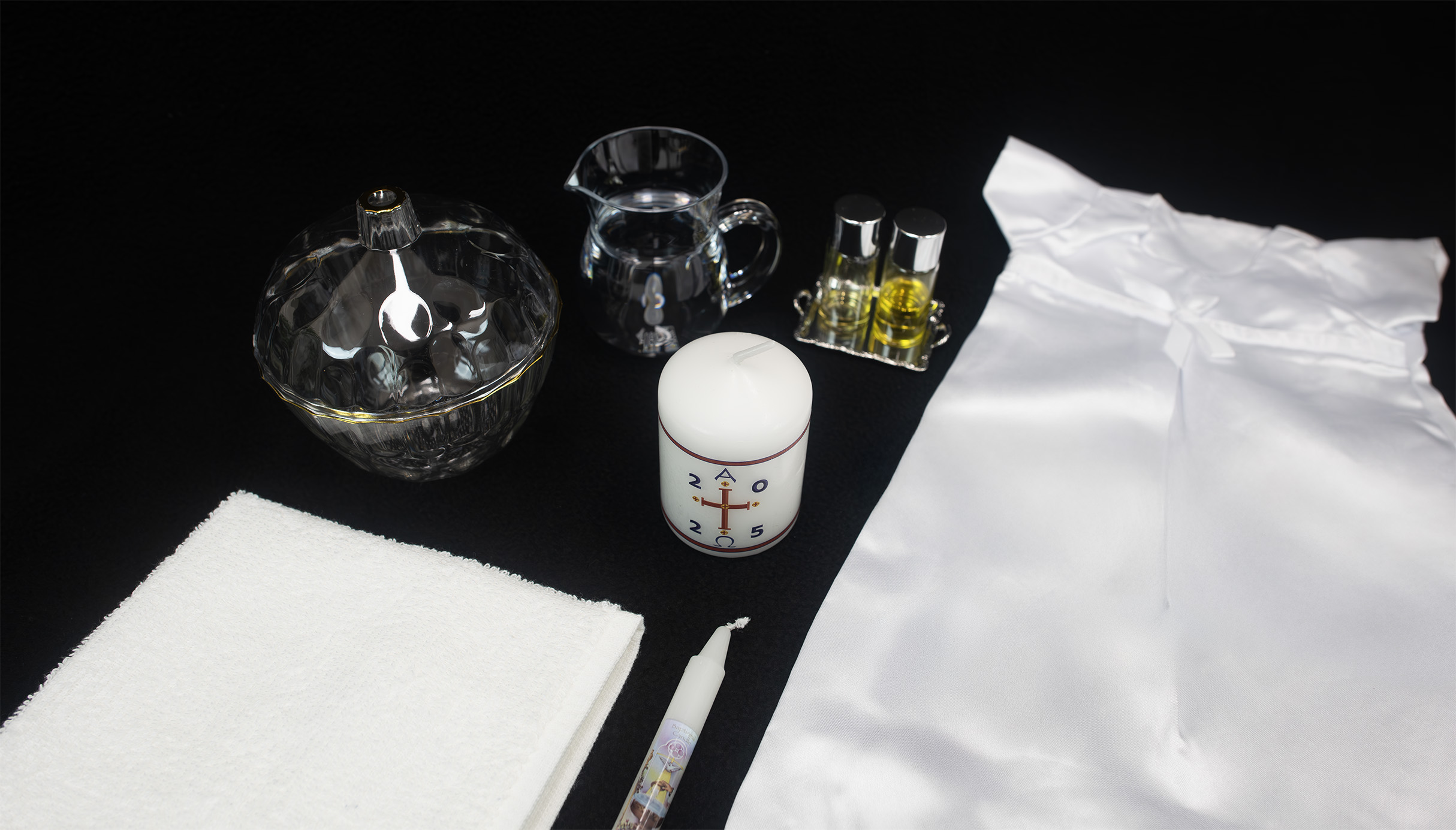 Set of materials to illustrate the defining actions and elements of the Sacrament of Baptism.