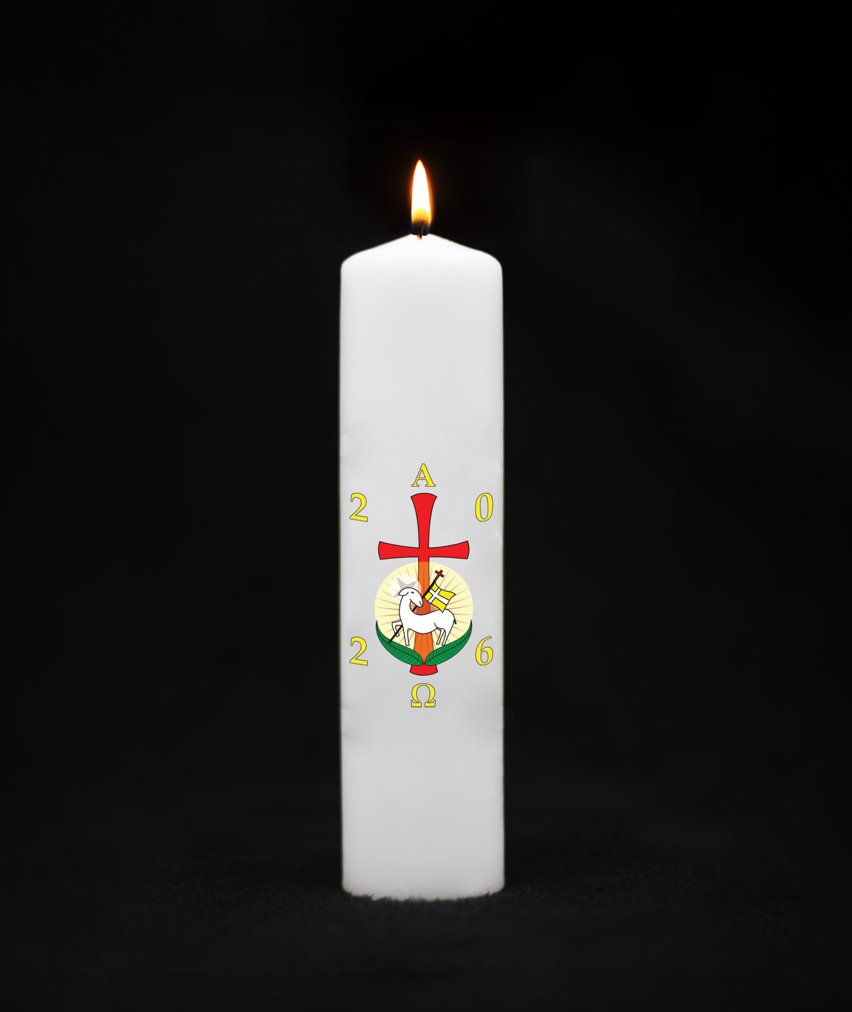 This sturdy wax candle can be used in any Religious Education session. It displays the Alpha & Omega symbols, the current year and the Cross.
